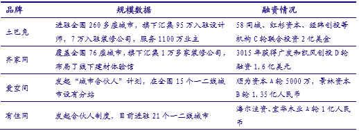 目前互联网家装主要有两种模式:以土巴兔、齐家网为代表的平台撮合模式,以爱空间、有住网为代表的自营整包模式。平台式家装主要解决了传统家装过程中家装链条过长、信息不对称问题。装修公司、工长、设计师及建材家具商入驻互联网家装平台,消费者可以通过撮合平台实现一站式家装采购,平台作为召集者,负责抓取用户流量、做用户交互,提供信息服务,也尝试涉入交易和监管,但不对装修本身向用户承担主要责任。自营式家装进一步整合了家装产业链,与家具建材品牌建立合作关系,自有库房、自养工人、自行施工,拥有核心产品的所有权,直接对装修负责。