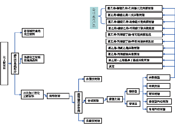特种氯乙烯共聚物由于生产工艺、应用领域、成份组成的独特性,在我国被归属于多个行业范畴。生产工艺上,特种氯乙烯共聚物生产属于精细化工的范畴;在应用领域上,由于特种氯乙烯共聚物系优良的粘合材料,乃油墨、涂料、胶粘剂和色片、磁卡基材、塑胶地板等的重要原材料,与人们日常生活密切相关,又可分属于涂料行业、油墨行业、包装行业、人造革行业、磁卡行业、胶粘剂行业等;在产品成份上,由于特种氯乙烯共聚物由氯乙烯及其它单体和助剂在引发剂的作用下发生聚合反应生成,属高分子聚合物,故又可归属于化工新材料中的特种树脂行业。行业细分类别如下: