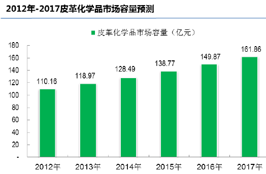 考虑到《中国皮革行业“十二五”发展规划》对“十二五”期间制革工业增长目标为10%,“十一五”期间制革行业工业总产值年均复合增长率为14.25%,且2008年-2012年轻革产量年均复合增长率为9.92%。审慎采用年均8%为参数,预测未来五年皮革化学品市场容量情况如下: