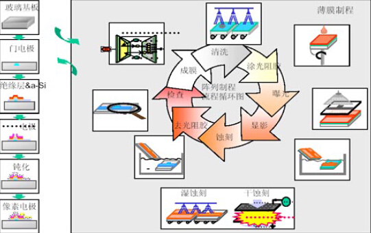一片表面平滑、没有任何杂质的玻璃基板,制成可用的薄膜电晶体,需要重复清洗、镀膜、上光阻、曝光、显影、蚀刻、区光阻等过程。一般来说,要制造TFT-LCD需要重复5到7次上述工序。湿电子化学品主要用于平板显示制造工艺环节的薄膜制程清洗、光刻、显影、蚀刻等工艺环节。具体工艺流程如下图所示: