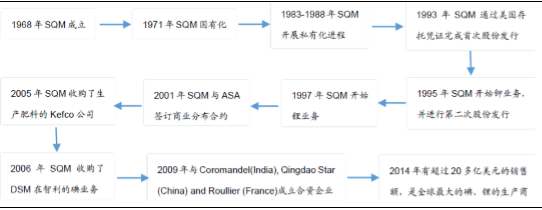 从国有化到私有化,再到公开上市:SQM公司于1968年因重组智利的硝酸盐工业而建立,创建初期公司由智利国家政府和CopaniaNitrateraAngloLautaroS.A.共同拥有。随后70年代初期,当时智利执政的阿连德政府企图通过国有化和扩大社会财富的方式,来实行广泛的社会改革,智利的硝酸盐工业被国有化,SQM公司也于1971年被完全收归智利政府国有。70年代中期,军政府上台,开始了一系列的改革。在改革过程中,政府强调“把生产资源配臵交给市场,把加速经济增长的主要任务交予积极性”的原则,并力图通过“价格自由化”、“金融自由化”和“国企私有化”来建立起“自由市场经济”。公司也于1983开始实施私有化,到1988年私有化成功完成,并于1993年通过美国存托凭证,在纽交所完成首次股份发行,成为上市企业。