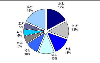 目前我国纯碱生产企业超过40家,占世界纯碱企业总数的一半以上,分布于我国22个省(直辖市、自治区),其中山东省、河南省、青海省、江苏省和河北省产能及产量分别位于前五位,产能合计占全国总产能的64.6%,产量合计占全国总产量的81%。