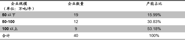 中国最大的纯碱生产商——三友化工,拥有340万吨/年合成纯碱产能,山东海化以300万吨/年合成纯碱能力具有中国第二,而最小的企业规模产能仅10万吨/年。就企业规模而言,产能50万吨/年以下的企业共19家,占国内纯碱企业数量的47.5%,产能总和仅占全国产能的15.99%;产能排名前五位的企业产能总计占到总产能的37%。中国纯碱企业平均规模仅为74万吨/年,行业集中度较低,与美国及欧洲纯碱企业相比仍存在较大差距。