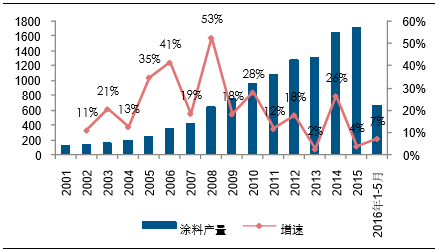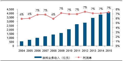 过去十年涂料行业经历了高增长和理性回归两个发展阶段:1)十一五期间,受益于宏观经济高速增长和成本优势,我国涂料产量复合增速接近40%,低市场门槛吸引大量资本涌入,形成了涂料企业遍地开花、激烈竞争的格局;2)十二五期间,我国涂料产量复合增速约为12%,在2015年增速下滑至4%,2016年上半年出现回升至7%。制造和消费升级趋势下,行业用工、环保、安全的要求越来越高,消费税和排污费的增收使涂料环境友好化加速,低端且不规范的企业被迫退出市场,2011年以后行业企业平均收入规模显著提高(近3倍)。