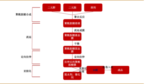 二步法包括合成聚酰胺酸和成膜亚胺化两步,在合成了所需的聚酰胺酸后,具有一定黏性的聚酰胺酸通过特定的成型方法成为均匀、特定厚度的薄膜,随后通过亚胺化将聚酰胺酸反应为聚酰胺酸并得到固态的聚酰亚胺薄膜。以流延拉伸法为例,流延、拉伸步骤属于成型工艺,采用脱水剂和催化剂的化学亚胺法则属于亚胺化方法。