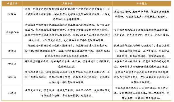 聚酰亚胺薄膜在亚胺化之前需要制膜成型,成型方法主要有流延法、流延拉伸法、浸渍法、喷涂法、挤出法和沉积法等。成型工艺对于薄膜的性能和生产方式影响极大,目前较为常用的方法为流延法和流延拉伸法,相比于流延法,流延拉伸法常用于制备高性能的聚酰亚胺薄膜。