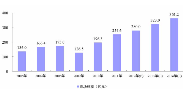 中国的聚醚多元醇生产厂家通过技术引进、自主研发等形成了一定规模。近年来,随着大型厂家的扩产,聚醚多元醇的品种规格基本齐备,产品质量及稳定性也大幅提高。2010年,中国聚醚多元醇的产量为130万吨,消费量约为161万吨,市场规模近200亿元。2011年,中国聚醚多元醇产量为155万吨,同比增长19.2%,消费量约168万吨,同比增长4.41%。根据中国石油和化工联合会的预计,2014年中国的聚醚多元醇产量将达到210万吨,年均复合增长率为10.65%;市场规模将超过360亿元,年均复合增长率为12.36%,具体情况如下图所示: