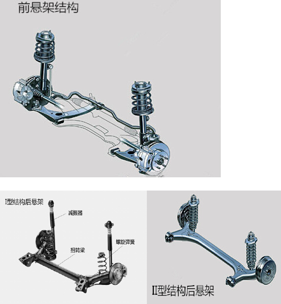 典型的汽车悬架结构由弹性元件、减震器以及导向机构组成,这三部分分别起缓冲,减振和力的传递的作用。