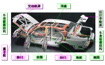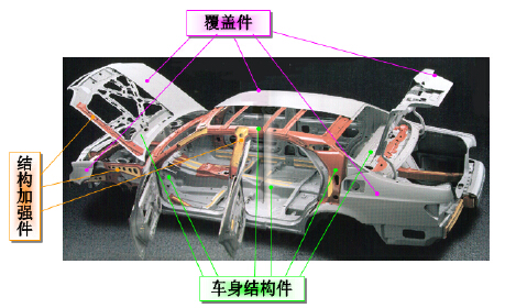 车身结构件具体包括车身前部、前围、地板、顶盖、侧围、车身后部,以及前翼子板、车门、发动