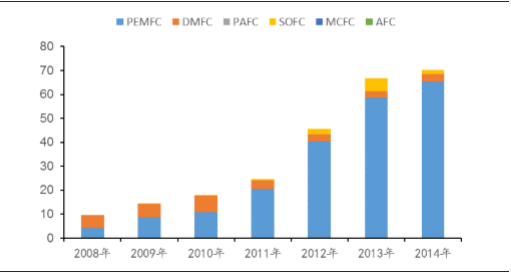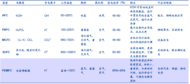 燃料电池一般是按电解质将其分为五大类,按其技术开发时间依序是碱性染料电池(AlkalineFuelCell,AFC)、磷酸型燃料电池(PhosphoricAcidFuelCell,PAFC)、熔融碳酸盐型燃料电池(MoltenCarbonateFuelCell,MCFC)、固体氧化物型燃料电池(SolidOxideFuelCell,SOFC)和质子交换膜燃料电池(ProtonExchangeMembraneFuelCell,PEMFC)。
