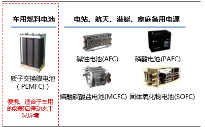 燃料电池是把燃料中的化学能通过电化学反应直接转换为电能的发电装置,其将常见可燃气体和液体如氢气、甲烷、天然气、沼气、乙醇、甲醇等燃料,通过催化剂提取能量,无需燃烧。目前车用燃料电池主要为氢燃料电池,从电解质区分则为离子交换膜燃料电池(PEMFC)。