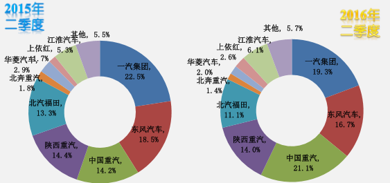 2、重卡行业整体竞争格局变化丌大,但行业龙头排名有所变化,不一季度相同,二季度中国重汽继续超越一汽、东风,市场份额位列重卡第一。