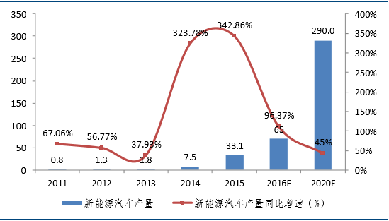 2015年我国新能源汽车产量37.9万辆,同比增长4倍,新能源汽车产量渗透率达1.35%。未来五年,在基数不断提高的基础上,新能源汽车产量仍将快速增长。我们预测至2020年,新能源汽车产量有望达290万辆,渗透率达9.27%,年复合增长45%。