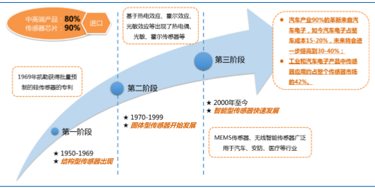 物联网已进入市场导入期,传感器已成我国物联网发展瓶颈。我国消耗全球四分之一MEMS器件,但进口信赖严重,目前传感器进口占比80%,传感器芯片进口占比达90%。中国电子信息产业发展研究院预测,未来五年国内传感器市场CAGR为31%,其中,汽车传感器市场潜在规模达57亿只,是目前的14倍以上。