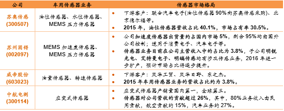 主营汽车油位传感器的苏奥传感(300507)、国产加速度传感器有绝对优势的苏州固锝(002079)、涉及汽车油量传感器和转速传感器的威帝股价(603023),以及有中科院研究背景优势的中航电测(300114)等。