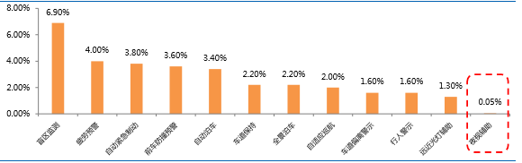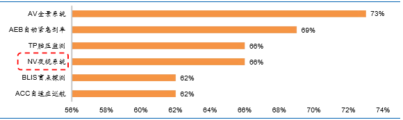 汽车夜视系统在消费群体中的接受程度较高。汽车夜视市场才刚打开,未来的市场规模基本是增量空间。BOSCH公司2015年对中国的汽车终端用户的调查显示,消费者最感兴趣的ADAS功能为全景辅助系统,占比达73%,夜视系统(66%)受欢迎程度并列第三位。