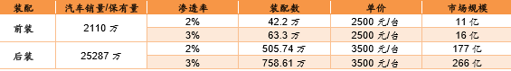 渗透率为2%时,总规模=11+177=188亿元;渗透率为3%时,总规模=16+266亿=282亿元。