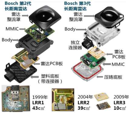 相比于第2代LRR需要用几个砷化镓芯片生成、放大并检测77GHz微波,Bosch第3代LRR极大简化了雷达天线PCB板,仅使用1或2个英飞凌硅锗芯片。