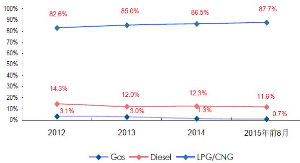 .美国:内燃叉车中,LPG/CNG动力叉车占比整体不断提升,目前已占据绝对主导地位,而柴油叉车由于主要用于户外和重型作业占比较小,天然气叉车占比也较小。2015年前8月,内燃叉车中,LPG/CNG、柴油(Diesel)和天然气动力叉车占比分为位87.7%、11.6%和0.7%。