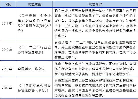 推进工业化与信息化深度融合,是我国转变发展方式、增强竞争实力的重要手段,烟草行业在以信息化带动工业化、以工业化促进信息化、走新型工业化道路的战略指引下,按照“统一标准、统一平台、统一数据、统一网络”,逐步实现系统集成、资源整合、信息共享的总体要求,全面启动了数字烟草建设。为推进烟草行业自动化和信息化建设上水平,国家烟草专卖局先后颁布了一系列促进