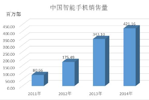 全球领域内,智能手机出货量从2009年的174.20百万部增长到2014年的1,310.10百万部,年复合增长率达到49.50%;中国市场方面,2011年至2014年期间,智能手机销售量从80.66百万部增长到421.16百万部,年复合增长率达到73.49%,保持了较高的增长速度。全球智能手机出货量