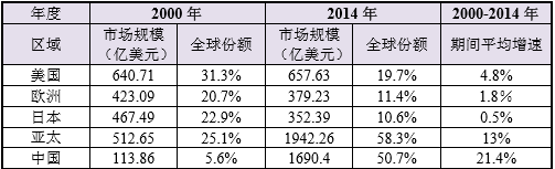 2000年至2014年,全球半导体市场规模由2043.94亿美元增长至3331.51亿美元。年均增速仅为3.6%。而与此同时,亚太地区(不含日本)半导体市场的年均增速则达到10%,规模从2000年的512.65亿美元快速扩大至2014年的1942.26亿美元。相应的,亚太地区在全球半导体市场中所占份额也由2000年时的25.1%大幅提升到2014年时的58.3%。亚太市场的快速增长绝大程度上得益于中国IC市场的发展。2000年中国IC市场规模为945亿元人民币(合113.86亿美元),到2014年已增至10393.1亿元人民币(合1690.4亿美元),年均增速高达21.4%。随着国内集成电路市场的飞速增长,其全球地位也在快速提升。2014年国内IC市场规模在亚太半导体市场所占比重已经达到87%,在全球半导体市场中所占比重也达到50.7%。中国已当之无愧成为全球半导体的“核心”市场。