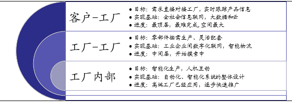 工厂内部:狭义的工业4.0,是生产的自动化和智能化,包含了机器和人的交流,最终达成智能工厂。终端产品领域,目前已经有部分企业引入了柔性化生产的概念,即根据客户的需求生产产品。考虑到目前汽车、3C是我国制造业中自动化程度较高的行业,因而未来预计在这些行业中也会涉及到越来越多的柔性化生产。标准化生产的过程中涉及到工业自动化的问题,这也是目前我国在4.0上努力的一个大方向。这其中包括机器系统集成、自动化解决方案、能效管理、工业控制系统等等。而部分企业作为智能工厂的试点也开始尝试4.0运作,包括青岛海尔、正泰电器等都是试点企业。