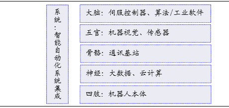 中国目前能做的工业3.X的各环节包括:智能自动化系统集成、传感器、机器视觉伺服控制器、算法/工业软件、机器人本体等。其中系统集成、检测识别领域应用到的核心元件标准化、代工成熟,其核心在于软件应用为主,是中国本土企业借助良好的本地优势、实现弯道超车的良机。