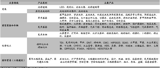 化学化工业务。集团充分利用军品技术和资源优势,重点发展特种化工和精细化工,产品在市场上的竞争力日益提高,经过多年的努力,部分重点民品在国内已具有较高的市场占有率,有的已位居国际前列。如:硝化棉市场占有率位居全球第一,金刚石市场占有率位居亚洲第一;TDI、硝基甲苯、纤维素、塑料管材、活性炭、石油钻具、火车轴等20多个民品市场占有率位居全国第一。