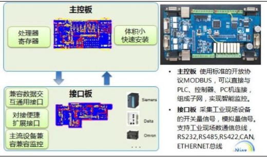 公司自主研发的智能核心零部件—嵌入式“信息采集板卡”(ICB-M1),可以嵌入原有设备的控制柜,采集工业现场设备的开关量信号,模拟量信号(收集传感器信号,仪表开关信号,模拟信号等),无需更换任何制造设备,仅是在原有设备的基础上进行升级加工。信息采集板卡(ICB-M1),可以较好的解决国内低端(电气化)生产设备与先进工业4.0技术之间的信息对接问题,基于ICB-M1的全套工业4.0改造方案,可以说是非常“接地气”的中国工业4.0制造业升级方案。国内厂商可以在不更换原有设备的基础上,实现工业4.0制造的升级,这在很大程度上缩减了工厂的升级成本,提供了工厂的生产效率,也为明匠智能公司智能工厂升级方案在国内制造业企业中的拓展赢得了口碑与声誉。