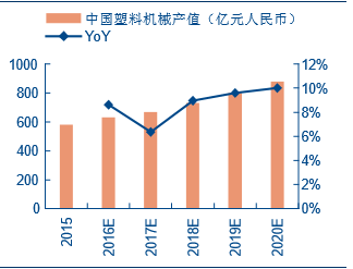 塑料机械是生产塑料制品的机械设备,包括注塑机、塑料挤出机等,我国需求量大。2016年初,中国塑料机械工业协会在“十三五”期间塑料机械行业发展重点中提出,行业经济运行年均增长10%以上,2020年工业总产值和销售额达到880亿元以上、塑机出口170亿元以上、贸易顺差10亿元以上等目标。