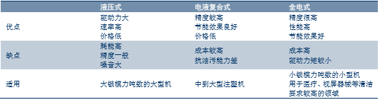 注塑机最初使用液压作为伺服系统。出于节能和精确度的需要,电气伺服在该领域中逐步普及。目前电液复合式伺服系统在注塑机应用已非常广泛,电液复合是用电气伺服驱动油泵,在运动精度提升的同时也使得驱动力得以保持。随着小型塑料制品对精度要求的进一步提升,全电式注塑机也逐步打开市场。全电式注塑机使用大功率伺服电机和驱动器作为传动设备,虽驱动力仍较小但精度很高,在生产3C制品塑料外壳等对精度高要求的小锁模力塑机上有广阔市场。