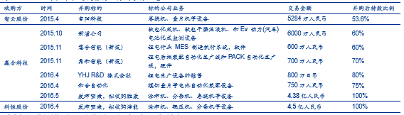 2015年上半年,以赢合科技、先导智能为代表的龙头企业陆续登陆资本市场,2015年下半年开始,在资本推动下龙头企业抓住行业洗牌机会,加快横向并购步伐:2016年4月科恒股份发布预案,拟以对价4.5亿元收购浩能100%的股权,2016年5月份赢合科技发布预案,拟以对价4.35亿收购雅康100%的股权,预计下半年行业将进入深度整合期,强强联合是大势所趋,市场份额继续向龙头企业集中,预计未来行业前3-5家企业有望占据50%以上的国内市场份额。