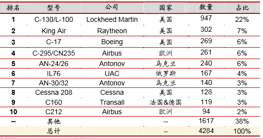 受制于军用飞机的敏感性和世界政治格局,逐渐形成了欧美及其同盟国、中俄及其他独联体、和其他国家三个阵营。美国凭借其强大的航空军事实力和政治影响力,成为了军用大型运输机领域当之无愧的龙头。在世界前十大运输机中,有4架由美国厂商制造,而仅由美国洛克希德·马丁公司生产的C-130“大力神”运输机就占据了全球军用运输机数量的20%以上,以洛克希德·马丁、波音公司为代表的美国企业独霸了全球军用运输机一半以上的市场。