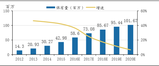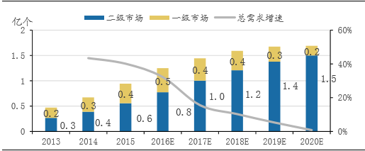 电动三轮车预计2020年将饱和,此时市场保有量达到1亿辆左右。我们通过电动三轮车每年新增保有量和已有保有量,可以分别测算出电动三轮车电池一级新增市场需求和二级更换需求,得到每年总需求。