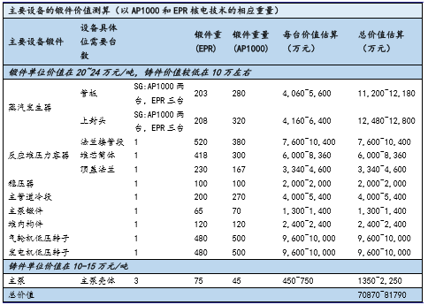 按1000MW设备投资在72亿计算,铸锻件的总价值在约为7~8亿。根据中国一重披露核岛锻件价值在每吨24~25万,而铸件价值的估计在10万/吨。基于设备重量,可以计算出各种设备所需主要锻件的价值表。
