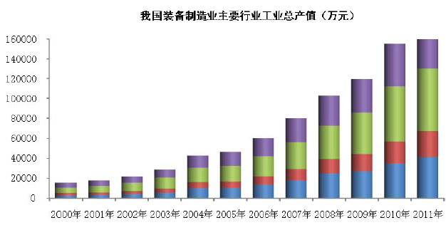 从总量规模上看,我国已进入世界装备制造大国行列,关系国民经济重点领域的装备制造取得重大进步,保障能力显著增强,产品结构和技术水平有了大幅度提高,一些产品的技术水平已接近或达到国际先进水平。根据国家统计局资料,我国装备制造业主要行业的工业总产值从2000 年的1.54 万亿元,增长到2011 年的18.18 万亿元。