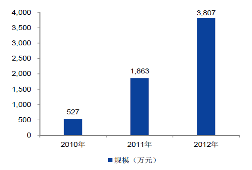 2012 年,国内车载AC-DC 充电机市场规模达到3,807 万元,同比增长104.35%。从其市场结构来看,输出功率小于5kW 的AC-DC 充电机占据市场较大的份额约为91.86%,大于5kW 的AC-DC 充电机市场份额约为8.14%。2010-2012年国内车载AC-DC充电机规模及增长情况