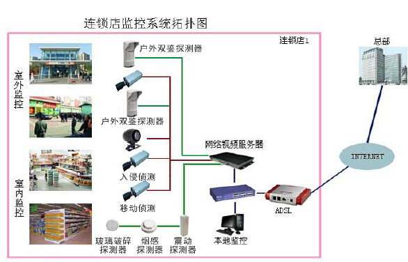 该系统包括前端报警设备、前端视频监控设备、视频服务器、DVR、中心视频控制服务器、客户端软件、中心视频控制软件等,典型示意图如下: