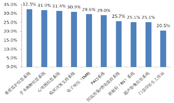 根据CHIMA2012年的调研统计结果,医院规划实施的临床业务信息系统排名前十的临床应用分别为重症监护临床信息系统、手术麻醉信息系统、心电图信息系统、临床决策支持系统、电子病历、PACS、医院传染/感染监控系统、RIS、超声影像信息系统、门急诊医生工作站;由此可以看出我国临床医疗管理信息系统在重要科室和核心治疗工具相关领域的应用在不断拓展,处于医院深化相关信息系统应用的阶段。