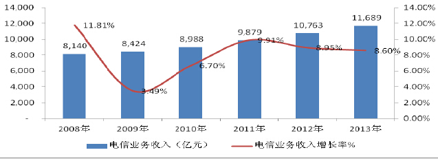 2008年至2013年中国电信业务收入持续增长,电信业收入的持续快速增长,增强了电信运营商的实力和投资意愿,推动着通信设备及相关产业的持续发展。