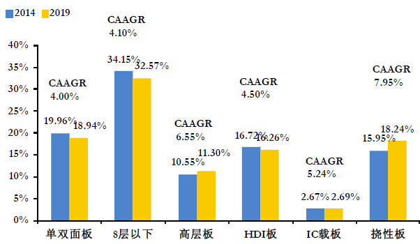 虽然中国目前从产业规模来看已经位居全球第一,但从PCB产业总体的技术水平来讲,仍然落后于世界先进水平。在产品结构上,技术含量较低的单面板、双面板以及8层以下多层板占比仍较大,2014年为54.11%。HDI板、挠性板等有一定的规模但在技术含量上与日本等国外先进产品存在差距,技术含量最高的IC载板在国内更是很少有企业能够生产,2014年IC载板占比仅有2.67%。但随着中国PCB技术的不断进步,高层板、HDI板、挠性板、IC载板等高技术含量板将迅速发展,市场前景广阔。中国PCB行业产品结构和发展趋势