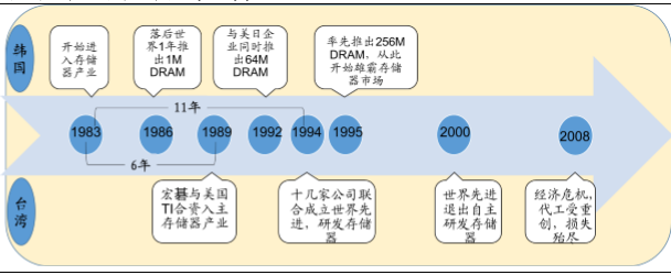 以台湾为例,尽管如今下游的组装、封装、LED等市场逐渐被大陆蚕食,半导体产业一直是台湾经济的支柱。台湾发展存储器产业比韩国晚几年,但却失了“天时”,一步晚,步步晚,最终导致了三十年后的天壤之别。三星1983年开始宣布发展存储器产业。6年后台湾开始与美国德州仪器合资发展存储器,此时,三星跟国际差距已经缩小至1年。再过5年,台湾发现需要集全岛之力重点发展存储器,十几家公司共同成立世界先进自主研发DRAM技术,此时三星技术上和国际巨头处于同一水平。第二年,三星赶超美日企业推出256MDRAM一举成为存储器行业老大,持续至今。再过5年(2000年),台湾先进退出自主DRAM之路,台湾存储器行业沦为代工。2008年经济危机后,台湾存储器代工产业损失殆尽,而三星继续成为行业寡头。