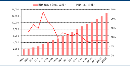 从市场空间上看,我国军民融合还有相当辽阔的发展潜力。我们假设中国国防预算以每年8%的增速稳定增长,2020年我国军费规模将达到12984亿元,其中武器装备建设费用占比1/3左右,假设民参军占比提升至50%,仅2020年民参军市场规模或将超过2164亿元,无限潜力亟待开发。