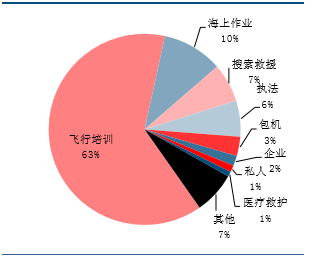 《意见》指出到2020年,建成500个以上通用机场,基本实现地级以上城市拥有通用机场或兼顾通用航空服务的运输机场,覆盖农产品主产区、主要林区、50%以上的5A级旅游景区。通用航空器达到5000架以上,年飞行量200万小时以上,培育一批具有市场竞争力的通用航空企业。与美国60%的公务机和私人应用占比结构不同,我国通航用途主要以飞行培训为主,占比高达63%。