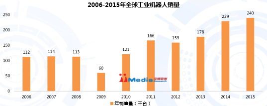 自全球金融风暴过后,市场复苏使得机器人行业恢复好转,全球机器人行业增长态势延续,市场规模不断扩大,各国政府和跨国企业在机器人行业投资活跃。2015年全球工业机器人销量超过24万台。