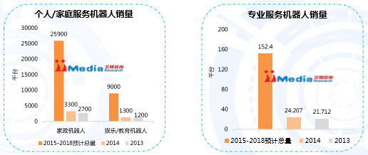 根据IFR(国际机器人联合会)预测显示,2015-2018年期间,个人/家庭用服务机器人的全球销量将高达2590万台,市场规模高达到122亿美元,超过2014年市场规模的5倍。专业服务用机器人的销售量会增加到15.2万台左右,市场规模会上升至196亿美元,接近2014年市场规模的5倍。