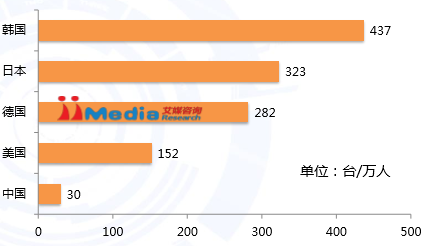2014年世界前五大机器人供应国机器人使用密度