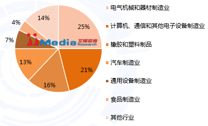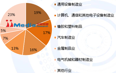 2015年国产工业机器人服务36个国民经济行业大类,87个国民经济行业中类,相较于2013年服务领域明显扩大。从应用行业看,2015年通用设备制造业和电子产品制造业的销售量市场占比最高。