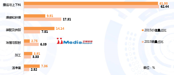 2015年国产工业机器人销量、市场价值(按应用领域分类)